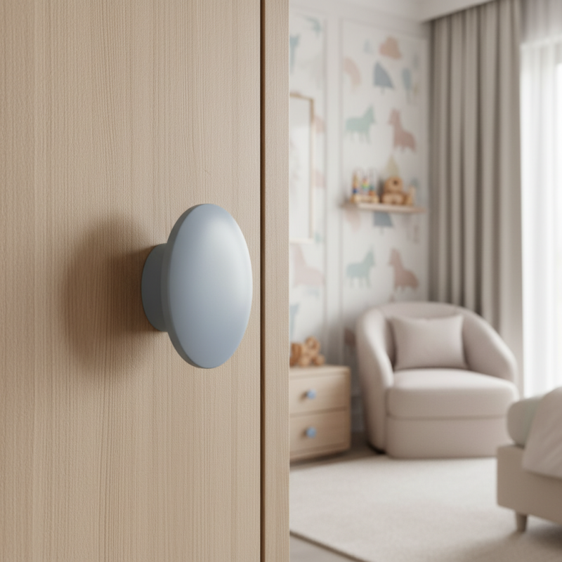 Jednoduchá a elegantná drevená úchytka v modernom modrom prevedení, vhodná na nábytok do detských izieb, moderných interiérov aj ako jemný farebný akcent. Vďaka svojmu tvaru sa príjemne drží a je vhodná na skrinky, zásuvky aj komody.