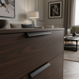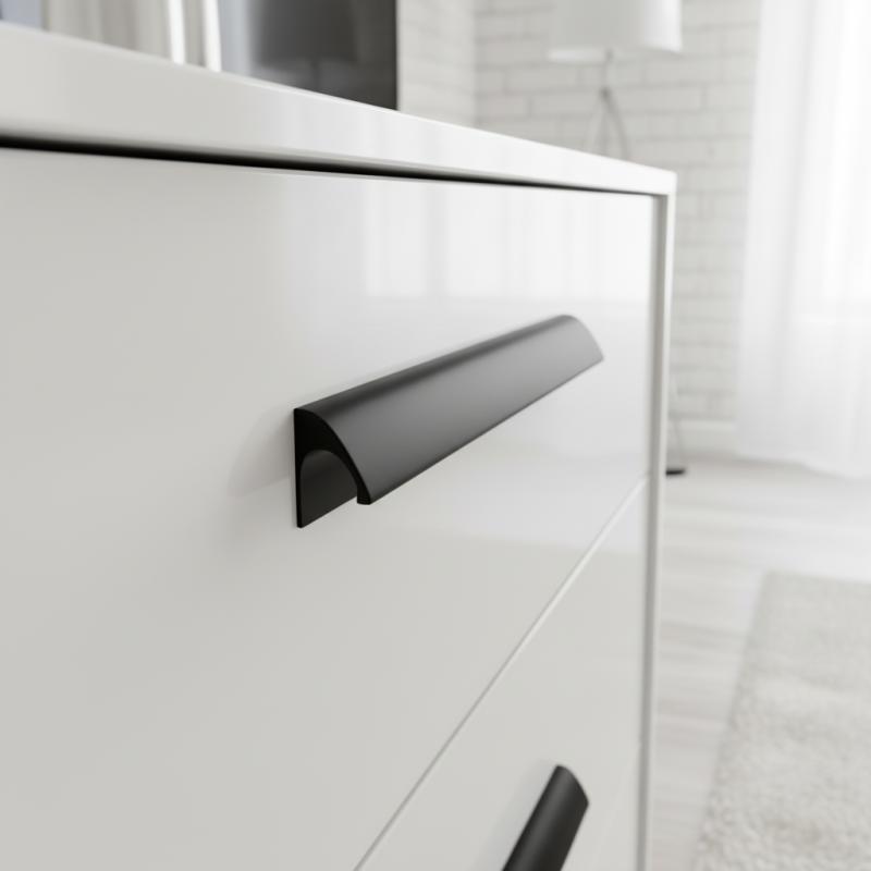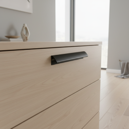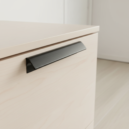 Úchytka NALU v čiernej matnej úprave predstavuje čistý, moderný dizajn s jemne oblým profilom, ktorý pôsobí elegantne a nadčasovo. Jej minimalistický tvar s hladkými líniami je navrhnutý tak, aby prirodzene splýval s nábytkom a zároveň vytváral decentný, ale výrazný dizajnový akcent. Matná čierna farba dodáva úchytke sofistikovaný vzhľad a výborne kontrastuje so svetlými povrchmi, pričom na tmavých pôsobí harmonicky a moderne.