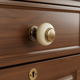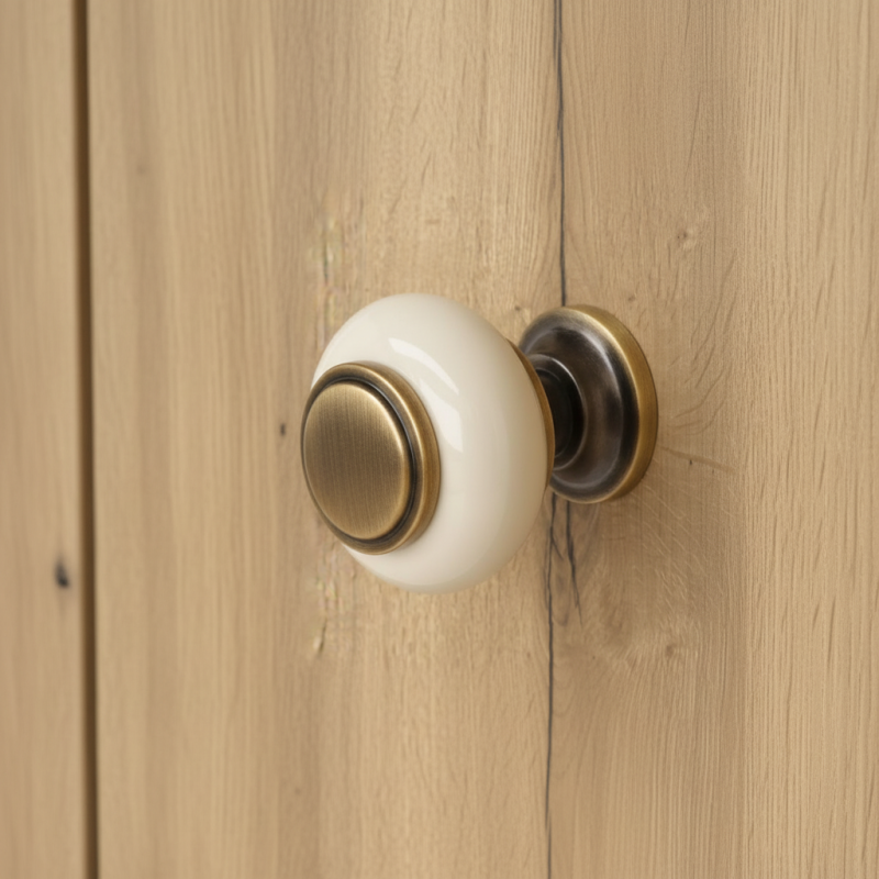 Porcelánová knopka RAENA v elegantnej zlatej patine je nadčasovým doplnkom, ktorý zmení každý kus nábytku na štýlový a luxusne pôsobiaci prvok. Spojenie krémového porcelánu a kovových detailov v jemnej patine vytvára harmonický a klasický vzhľad vhodný do rôznych typov interiérov.