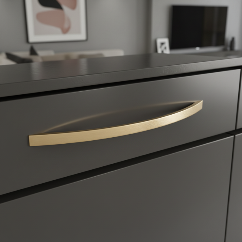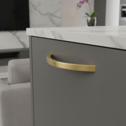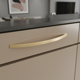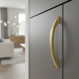 Elegantná a nadčasová úchytka EMILIO v brúsenom zlatom prevedení je dokonalým doplnkom pre moderný aj klasický nábytok. Jej jemne prehnutý tvar pôsobí luxusne a zároveň ergonomicky – pohodlne sa používa a dodá nábytku štýlový akcent.