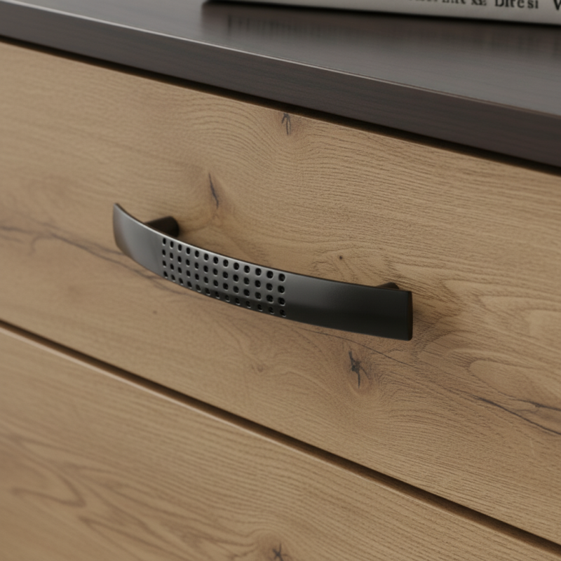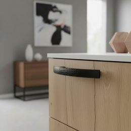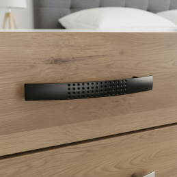 Úchytka VELLEN v elegantnom čiernom matnom prevedení prináša výrazný moderný akcent vhodný do minimalistických, industriálnych aj trendových interiérov. Jemne prehnutý tvar spolu s dekoratívnou bodkovanou štruktúrou zaručujú príjemné používanie a atraktívny vzhľad na každom type nábytku.