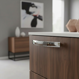 Lesklý chróm dodáva nábytku svieži, moderný a elegantný výraz. Úchytka VELLEN sa tak stáva nielen praktickým, ale aj esteticky výrazným doplnkom, ktorý dokonalo doplní rôzne typy moderných interiérov.