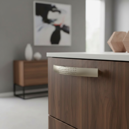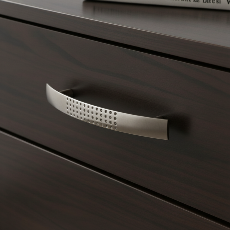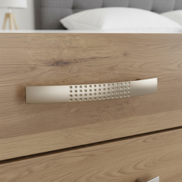 Úchytka VELLEN v nikel matnom prevedení pôsobí elegantne, nadčasovo a veľmi univerzálne. Jemne prehnutý tvar sa pohodlne uchopuje a dekoratívna štruktúra drobných bodiek dodáva úchytke zaujímavý vizuálny efekt aj praktickú protišmykovú funkciu. Ideálna do moderných aj minimalistických interiérov.