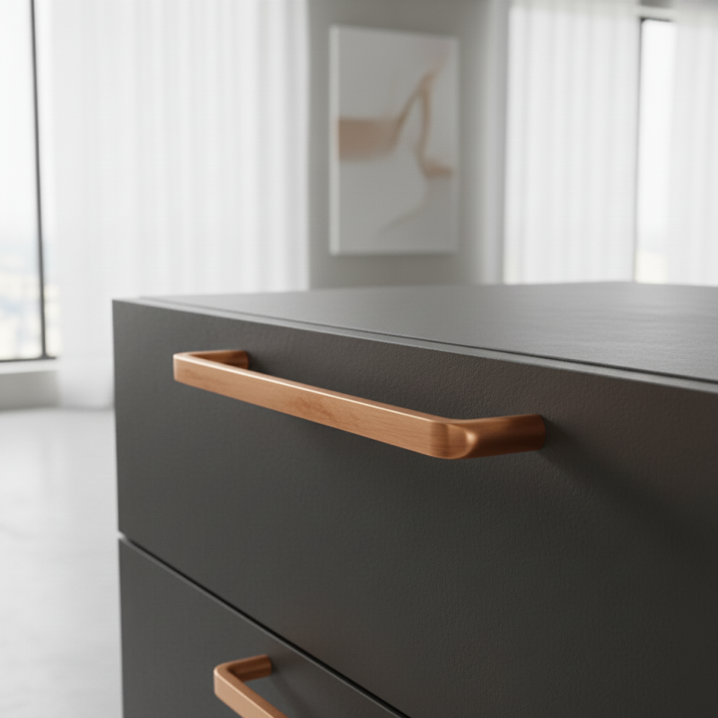 Štýlová úchytka BRISA v povrchovej úprave medená je výnimočným dizajnovým doplnkom pre nábytok v modernom, industriálnom aj vintage štýle. Teplý medený odtieň dodáva skrinkám či komodám unikátny charakter a zaujímavý vizuálny akcent, ktorý krásne vynikne na tmavom dreve, čiernom nábytku aj svetlých plochách.