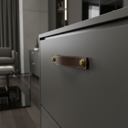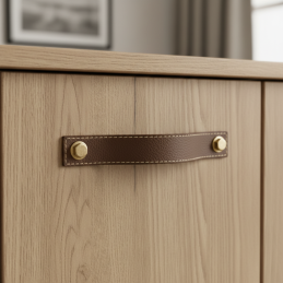 Elegantná a pevná kožená úchytka SAMSONITE v hnedom prevedení dodá nábytku príjemný prírodný a zároveň luxusný charakter. Kombinuje kvalitnú pravú kožu s masívnymi kovovými skrutkami, ktoré jej dodávajú industriálny podtón.