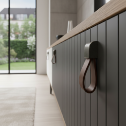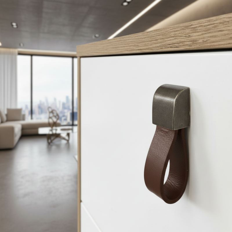 Úchytka je ideálnym doplnkom pre moderný, vidiecky aj industriálny nábytok a vďaka prirodzenej flexibilite kože je pohodlná a praktická pri každodennom používaní.