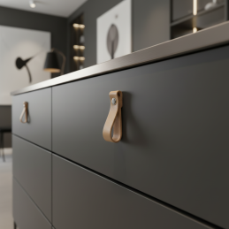 Elegantná kožená úchytka DOLCE Mini z prírodnej kože je štýlový doplnok pre moderný aj klasický nábytok. Mäkký kožený pásik pôsobí minimalisticky, je príjemný na dotyk a vytvára prirodzený teplý akcent v interiéri. Vďaka svojmu tvaru je ideálna pre zásuvky, dvierka či menší nábytok.