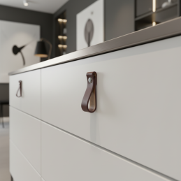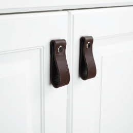 Elegantná kožená úchytka DOLCE Mini v tmavohnedom odtieni dodá nábytku sofistikovaný a prírodný vzhľad. Pravá koža s jemnou textúrou pôsobí luxusne, pričom zachováva minimalistický a nadčasový dizajn. Skvelo sa hodí do moderných, prírodných aj industriálnych interiérov.