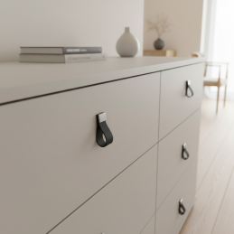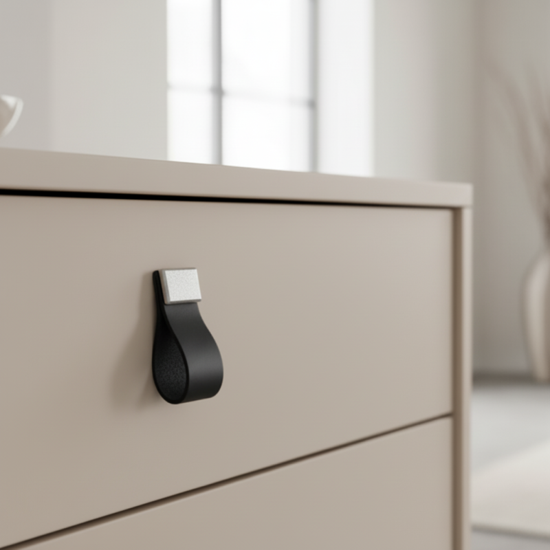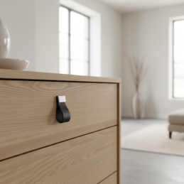 Verzia čierna koža + hliníková koncovka krásne ladí s moderným nábytkom, svetlými dvierkami aj industriálnymi prvkami. Elegantná, funkčná a príjemná na dotyk – ideálna voľba pre nadčasový interiér.