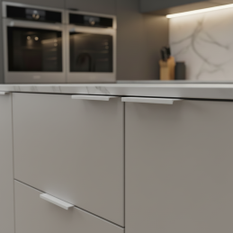 Úchytka RIOS v modernom prevedení biela matná je ideálnym riešením pre luxusné interiéry a dizajn.. Montuje sa priamo na hranu (hornú alebo bočnú), čím vytvára čistý, elegantný a veľmi praktický vzhľad.
