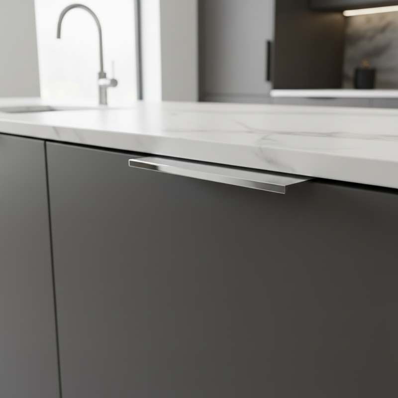 Je vyrobená z kvalitného kovu s odolnou matnou povrchovou úpravou, ktorá je príjemná na dotyk a zároveň odoláva poškriabaniu. Tenký, nenápadný profil pôsobí moderne a dokonale zapadne do kuchyne, kúpeľňového nábytku či obývacích zostáv.