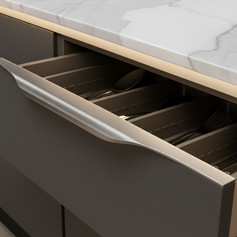 Moderná zafrézovacia úchytka LUTRA v prevedení nerez je ideálnou voľbou pre elegantné a nadčasové interiéry. Osádza sa priamo do hrany dvierok alebo zásuvky, čím vytvára čistý minimalistický vzhľad bez rušivých prvkov.