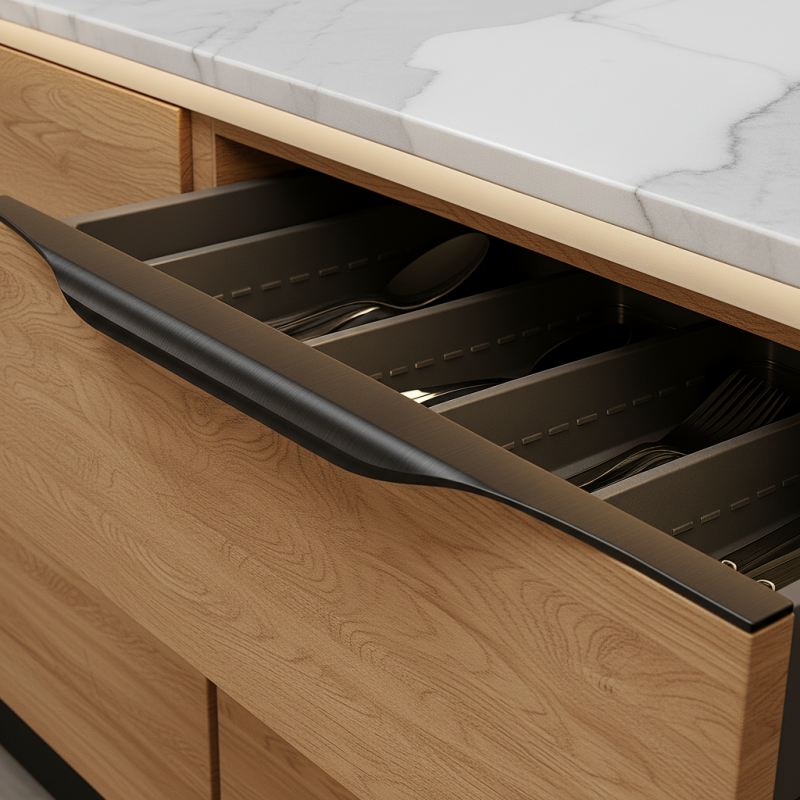 Elegantná zafrézovacia úchytka LUTRA v prevedení čierna brúsená je dokonalou voľbou pre moderné interiéry, kde dominujú čisté línie a minimalistický dizajn. Úchytka sa montuje priamo zafrézovaním do hrany dvierok alebo zásuvky, čím vytvára luxusný bezúchytkový vzhľad.