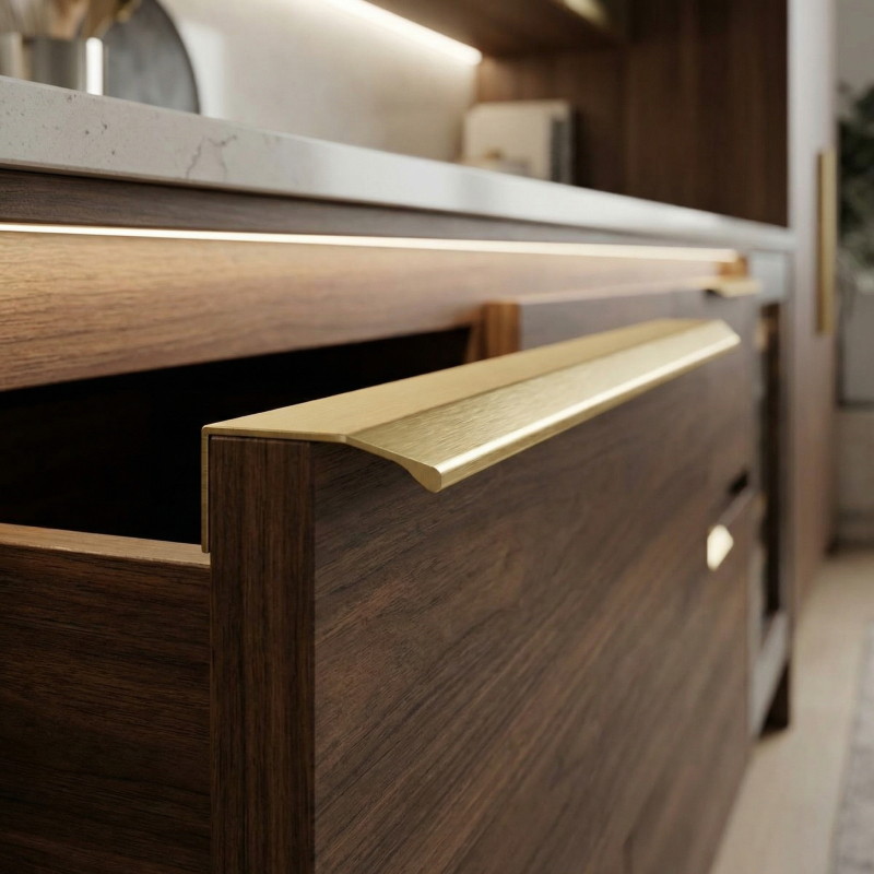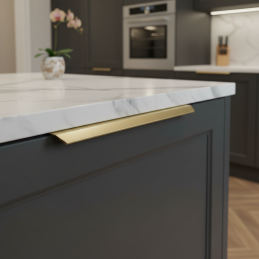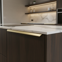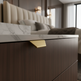 Elegantná hranková úchytka MAURA v prevedení zlatá brúsená je moderným riešením pre čistý a minimalistický vzhľad nábytku. Montuje sa na hornú hranu dvierok, čím vytvára nenápadný, no výrazný dizajnový detail. Brúsený zlatý povrch dodáva interiéru luxusný a nadčasový charakter.