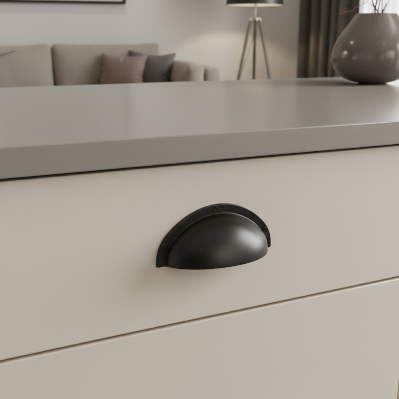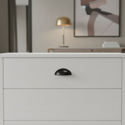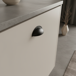 Úchytka ZENA v prevedení čierna matná kombinuje tradičný tvar mušľovej úchytky s moderným minimalistickým vzhľadom. Jej polkruhový dizajn poskytuje pohodlné uchopenie, zatiaľ čo matná čierna povrchová úprava dodáva nábytku výrazný, elegantný a zároveň nadčasový akcent.