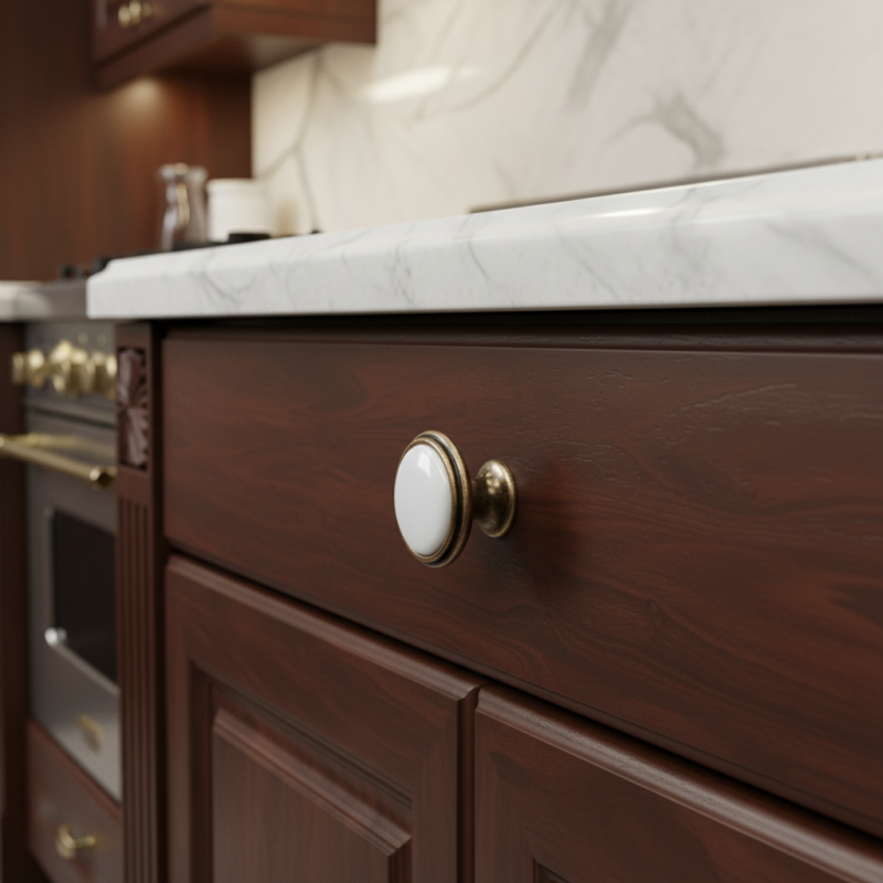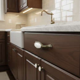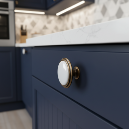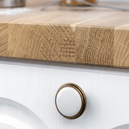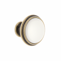Knopka RITA v povrchovej úprave starozlatá je krásnym doplnkom pre klasické, vidiecke aj romantické interiéry. Kombinuje tradičný kovový tvar so stredovou porcelánovou vložkou v bielej farbe, ktorá dodáva knopke jemný, luxusný a čistý vzhľad.