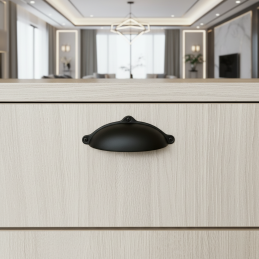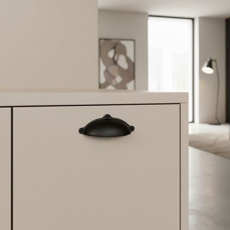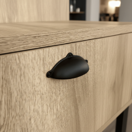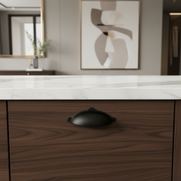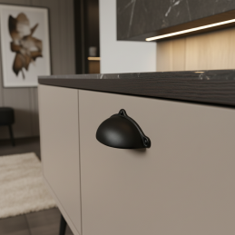 Úchytka MELANIE v modernom čiernom matnom prevedení je elegantným a nadčasovým doplnkom pre komody, skrinky, kuchynský nábytok či šuplíky. Jej ikonický „miskový“ tvar poskytuje mimoriadne pohodlný úchop a zároveň dodáva nábytku štýlový retro nádych, ktorý v čiernej matnej farbe pôsobí mimoriadne moderne a sofistikovane.