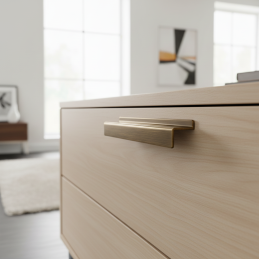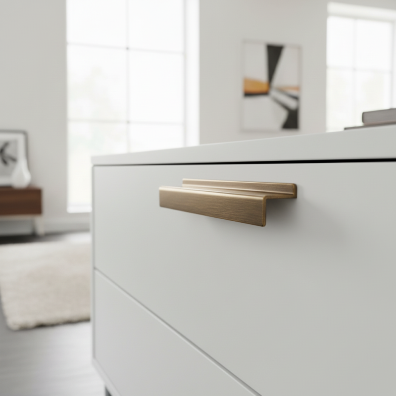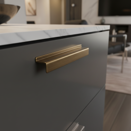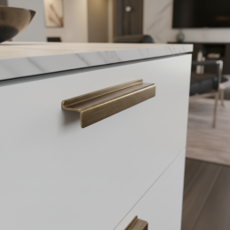 Úchytka BRUNA v prevedení staromosadz prináša do interiéru nádych klasickej elegancie spojený s moderným minimalistickým tvarom. Ide o hranatú L-úchytku určenú na montáž na hornú hranu dvierok či zásuviek, čo umožňuje otváranie bez viditeľného tradičného madla. Tento dizajn vytvára čistý, súčasný a zároveň remeselne pôsobivý vzhľad.