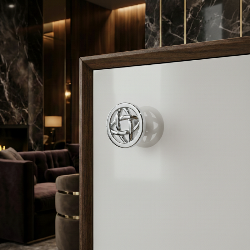 Dekoratívna knopka ALINA v prevedení lesklý chróm vyniká jemným prepletaným vzorom, ktorý dodáva nábytku elegantný a zároveň originálny vzhľad. Lesklý chrómový povrch pôsobí moderne a luxusne, vďaka čomu sa hodí do klasických aj súčasných interiérov.