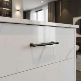 Elegantná úchytka RUNA v čiernom matnom prevedení zaujme svojím jemne tvarovaným profilom a decentnými detailmi na koncoch. Vďaka nadčasovému dizajnu je vhodná do moderných aj klasických interiérov – kuchyne, kúpeľne, spálne či obývacej izby.