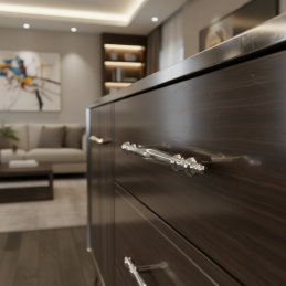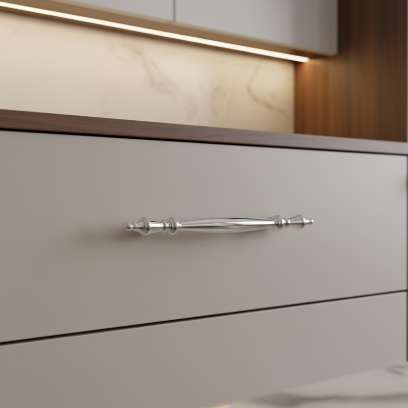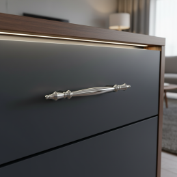 Úchytka SANDVIKA v povrchovej úprave lesklý chróm je dokonalou voľbou pre interiéry, kde sa spája klasická elegancia s moderným leskom. Jej prepracovaný tvar s dekoratívnymi prvkami pôsobí noblesne a dodá nábytku výnimočný charakter – či už ide o komody, vitríny, skrinky alebo šuplíky.