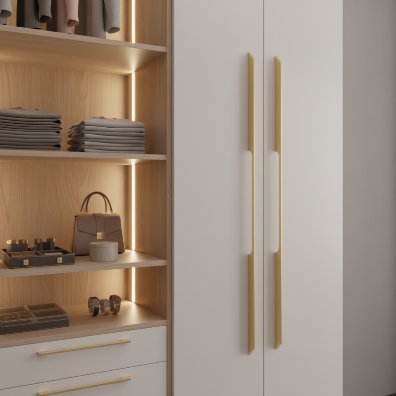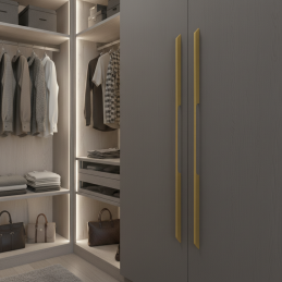 Moderná šatníková úchytka HANNA v elegantnom zlatom prevedení je výrazným dizajnovým prvkom určeným pre vysoké šatníkové skrine a veľkoformátové dvierka. Jej štíhly, minimalistický tvar s jemným zalomením pod uhlom 45° pôsobí luxusne a zároveň zabezpečuje pohodlný úchop.