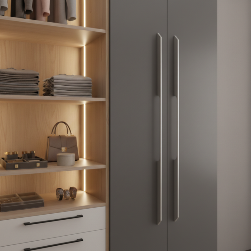 Moderná šatníková úchytka HANNA v prevedení chróm matný je elegantným a funkčným doplnkom pre vysoké šatníkové skrine a veľké dvierka. Jej štíhly, minimalistický tvar s jemným zalomením pod uhlom 45° pôsobí čisto a nadčasovo, pričom zabezpečuje pohodlný a prirodzený úchop.