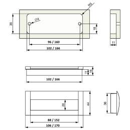 Pre rozteč 160 mm: otvor 166 × 36 mm, hĺbka 11 mm