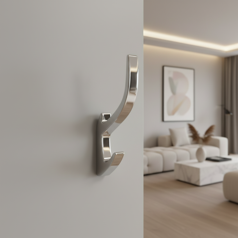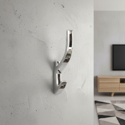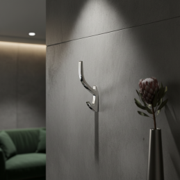 Elegantný a moderný vešiak KOS v lesklom chrómovom prevedení pôsobí luxusne a nadčasovo. Vďaka svojmu čistému dizajnu a jemnému lesku je ideálny do moderných i klasických interiérov. Ponúka dva praktické háčiky vhodné na odkladanie oblečenia, uterákov či doplnkov.