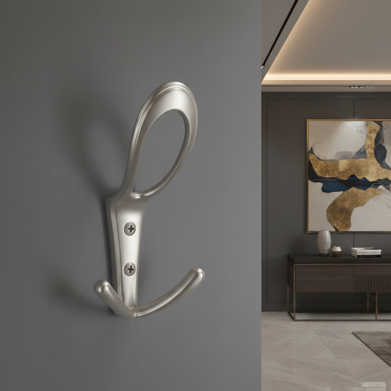 Vešiak disponuje spodným dvojitým háčikom, ktorý poskytuje dostatok miesta na zavesenie kabátov, búnd, tašiek či doplnkov. Je určený na montáž zpredu na stenu alebo nábytok. Súčasťou balenia sú montážne skrutky vo farebnom prevedení zodpovedajúcom vešiaku, čo zabezpečuje čistý a jednotný vzhľad po namontovaní.