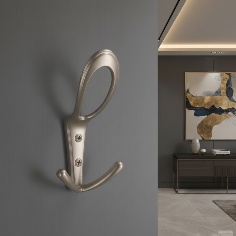 Vešiak je vybavený spodným dvojitým háčikom, ktorý poskytuje dostatok priestoru na zavesenie kabátov, búnd, tašiek alebo doplnkov. Je určený na montáž zpredu na stenu alebo nábytok, pričom montážne skrutky sú súčasťou balenia a farebne zladené s vešiakom, čím je zabezpečený čistý a jednotný vzhľad.