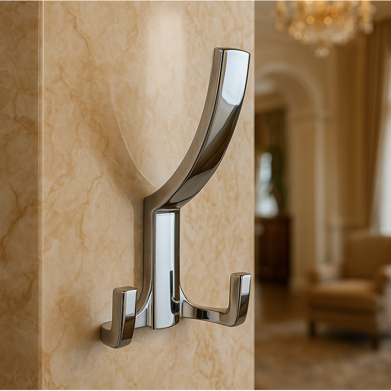 Trojháčiková konštrukcia – dva menšie háčiky dole pre tašky, doplnky alebo uteráky a jeden veľký horný hák na kabáty či ťažšie veci.