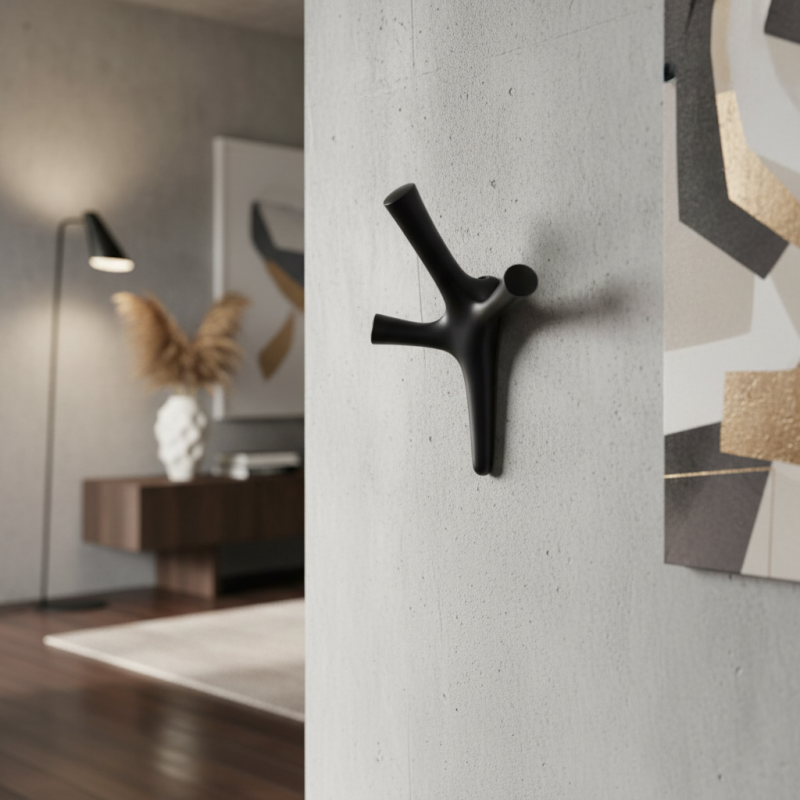 Dizajnový vešiak ALAN v prevedení čierna matná je moderným a praktickým doplnkom do predsiene, chodby, kancelárie alebo šatníka. Vďaka originálnemu tvaru pripomínajúcemu vetvu ponúka viacero háčikov na zavesenie kabátov, búnd, tašiek alebo doplnkov.