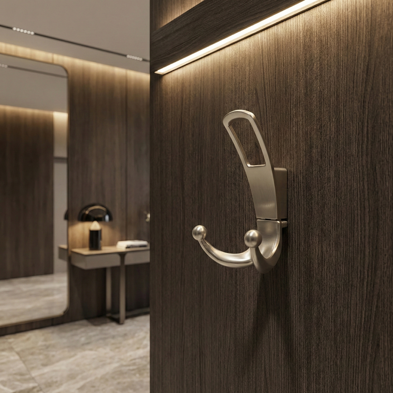 Vešiak má jednodielnu konštrukciu so spodným dvojitým háčikom, ktorý poskytuje dostatok priestoru na zavesenie kabátov, búnd, tašiek alebo doplnkov. Je určený na montáž zpredu na stenu alebo nábytok, s viditeľnými upevňovacími bodmi pre jednoduchú a rýchlu inštaláciu.