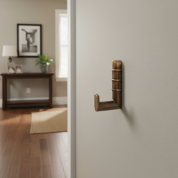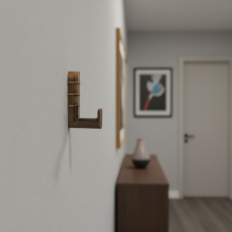 Vešiak je vyrobený z kvalitného kovu s brúsenou mosadznou povrchovou úpravou, ktorá pôsobí teplo a elegantne. Montáž je z prednej strany na podložku, čo zabezpečuje pevné uchytenie a jednoduchú inštaláciu.