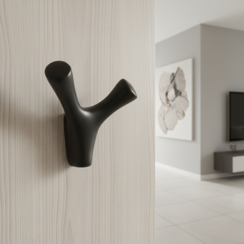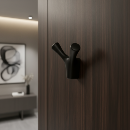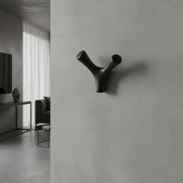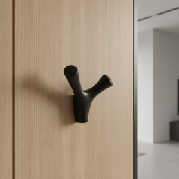 Vešiak YPSILON v čiernej matnej úprave predstavuje elegantný a nadčasový prvok, ideálny do moderných interiérov. Tvar pripomínajúci písmeno Y umožňuje pohodlné zavesenie odevov, tašiek či doplnkov. Je vyrobený z kvalitného, odolného materiálu s hladkým povrchom, ktorý zaručuje dlhú životnosť a príjemný dotyk.