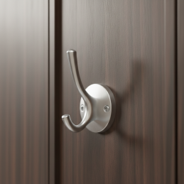 Vešiak je vybavený dvojitým háčikom, ktorý poskytuje dostatok priestoru na zavesenie kabátov, búnd, kabeliek či doplnkov. Je určený na montáž zpredu na stenu alebo nábytok, pričom upevňovacie skrutky sú viditeľné a decentne zapracované do dizajnu rozety.