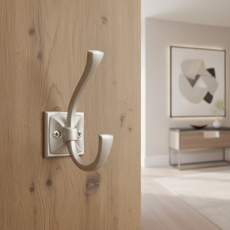 Vešiak sa montuje z predu pomocou skrutiek, ktoré sú farebne zladené s jeho povrchom. Elegantná štvorcová podložka a tvarované ramená vešiaka vytvárajú harmonický a vizuálne atraktívny celok.