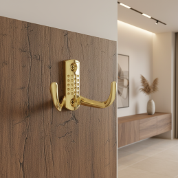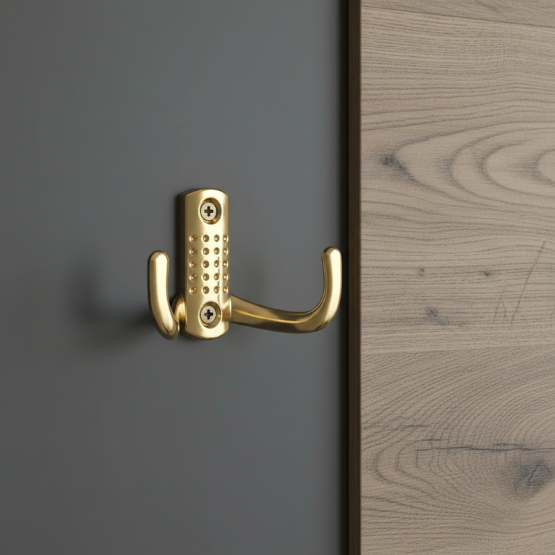 Luxusný nábytkový vešiak s dvoma háčikmi, ktorý vďaka lesklej zlatej povrchovej úprave pôsobí výrazne, moderne a dodáva nábytku prémiový vzhľad. Ideálny do elegantných interiérov, šatníkov a reprezentatívnych priestorov.