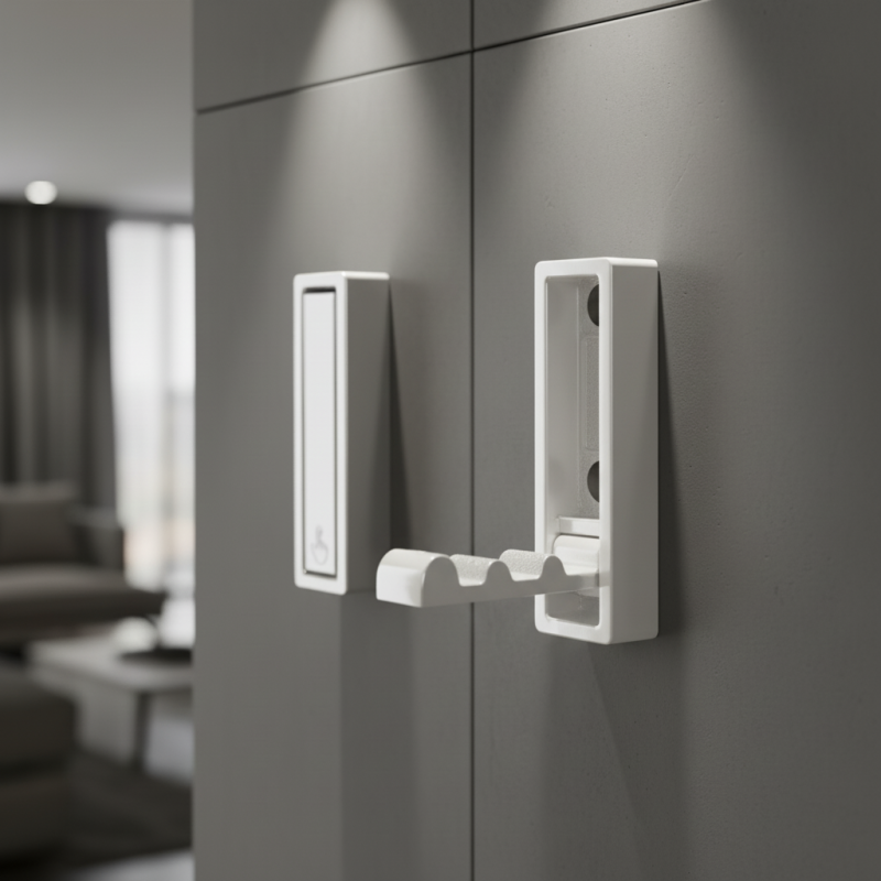 Jednoduchý vešiak s montážou z predu s výškou 70 mm a šírkou 20 mm. Skrutky na uchytenie sú súčasťou vešiaku. Vešiak sa stlačením jednoducho vyklápa. Vešiak sa montuje na povrch a nie je nutné ho frézovať do nábytku či materiálu.