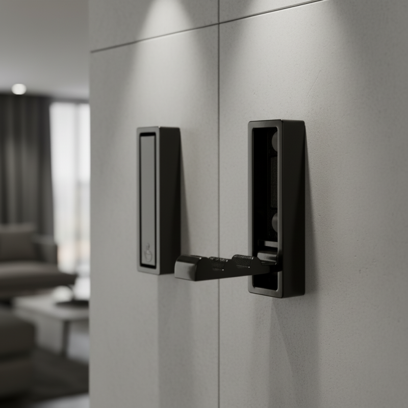 Jednoduchý vešiak s montážou z predu s výškou 70 mm a šírkou 20 mm. Skrutky na uchytenie sú súčasťou vešiaku. Vešiak sa stlačením jednoducho vyklápa. Vešiak sa montuje na povrch a nie je nutné ho frézovať do nábytku či materiálu.