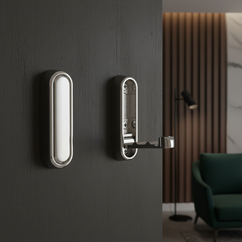 Jednoduchý vešiak s montážou z predu s výškou 74 mm a šírkou 24 mm. Skrutky na uchytenie sú súčasťou vešiaku. Vešiak sa stlačením jednoducho vyklápa. Vešiak sa montuje na povrch a nie je nutné ho frézovať do nábytku či materiálu.