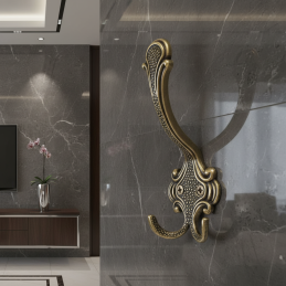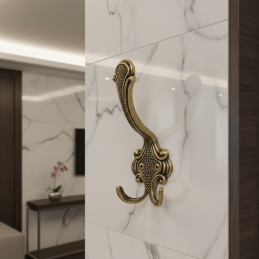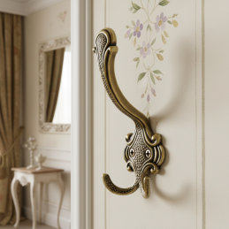 Rustikálny vešiak VENICE v povrchovej úprave staromosadz predstavuje elegantný a výrazný doplnok do interiéru. Jeho bohato tvarované línie, reliéfne zdobenie a klasický vzhľad vytvárajú autentickú atmosféru vintage a vidieckeho štýlu. Vďaka predĺženému ramenu a dvojitému háku ponúka praktické využitie v predsieni, kúpeľni, kuchyni či šatníku.