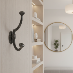 Vešiak je určený na zadnú montáž do nábytku alebo nábytkovej steny, čo zabezpečuje čistý a estetický vzhľad bez viditeľných upevňovacích prvkov. Robustné spracovanie a kvalitný kovový materiál zaručujú dlhú životnosť a vysokú nosnosť.