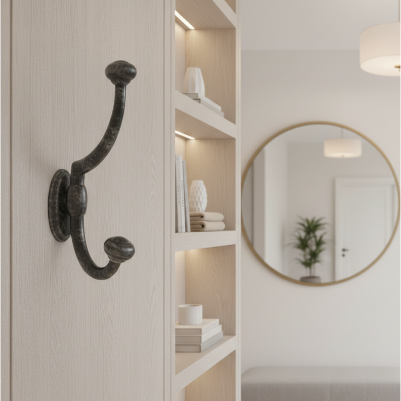 Rustikálny vešiak PLUTO v elegantnom staročiernom prevedení je praktickým a zároveň dizajnovým doplnkom do interiéru. Vďaka svojmu nadčasovému tvaru s dvomi háčikmi ponúka dostatok priestoru na zavesenie oblečenia, kabeliek, tašiek či doplnkov.