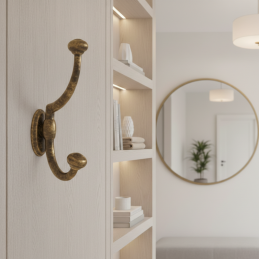 Vešiak PLUTO v prevedení staromosadz je ideálnou kombináciou funkčnosti a dekoratívneho dizajnu, ktorá dodá vášmu interiéru teplý, rustikálny nádych.