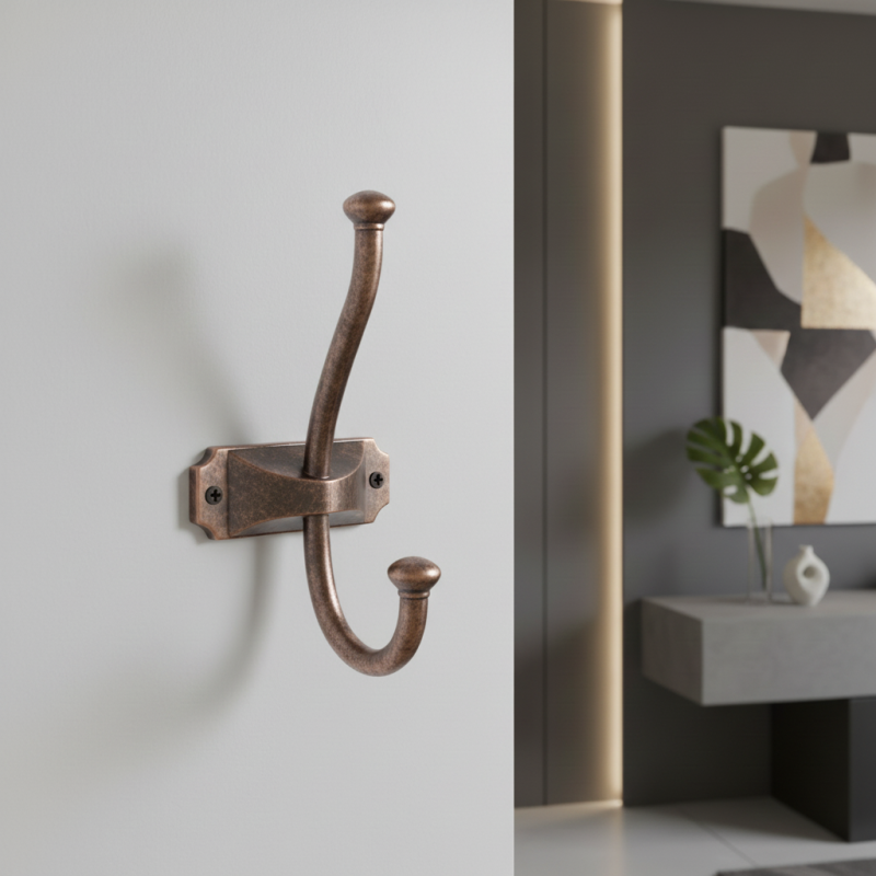 Nábytkový vešiak PORTO v povrchovej úprave meď patina je vkusný, praktický a dekoratívny doplnok, ktorý vynikne v rustikálnych, industriálnych, vidieckych aj moderných interiéroch. Jeho dvojháčiková konštrukcia umožňuje jednoduché a prehľadné zavesenie odevov či doplnkov – horný háčik je ideálny pre kabáty a bundy, spodný pre tašky, šály alebo menšie predmety.