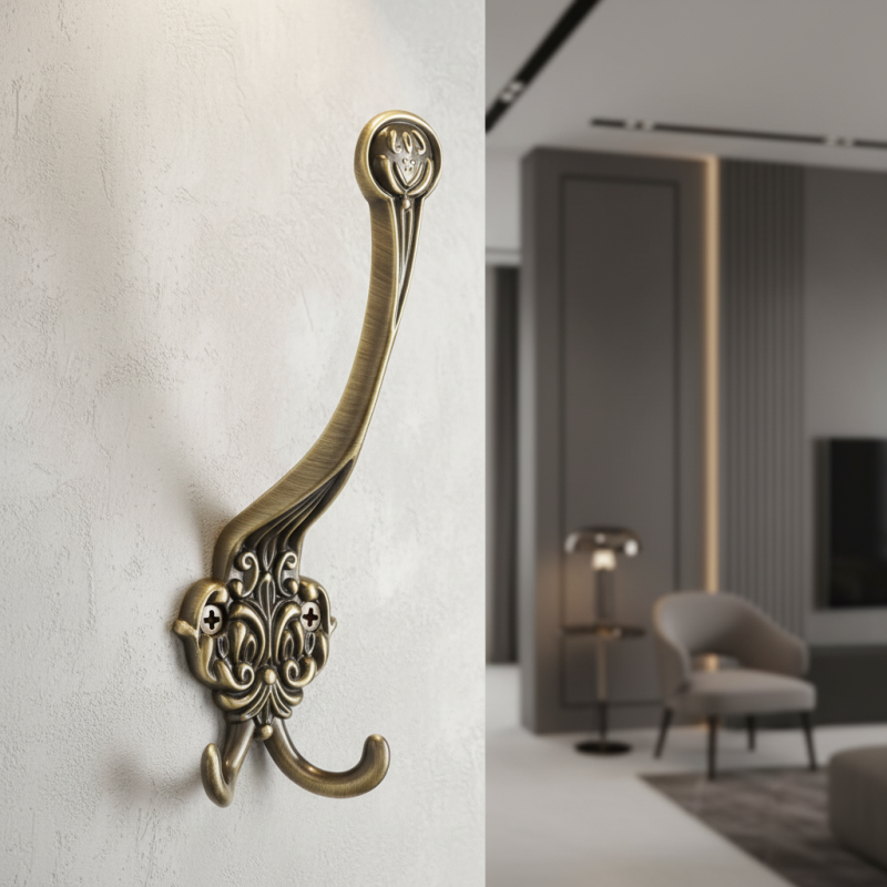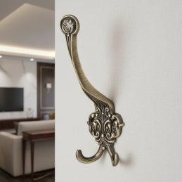 Povrchová úprava v staromosadzi s jemnou patinou zvýrazňuje plastické ornamenty a dodáva vešiaku hĺbku a teplý kovový tón. Dvojitý háčik poskytuje dostatok priestoru na zavesenie kabátov, tašiek či doplnkov a zároveň zvyšuje praktickosť pri každodennom používaní. Vešiak je vhodný do predsiení, chodieb, šatníkov, ale aj do štýlových hotelov či penziónov.