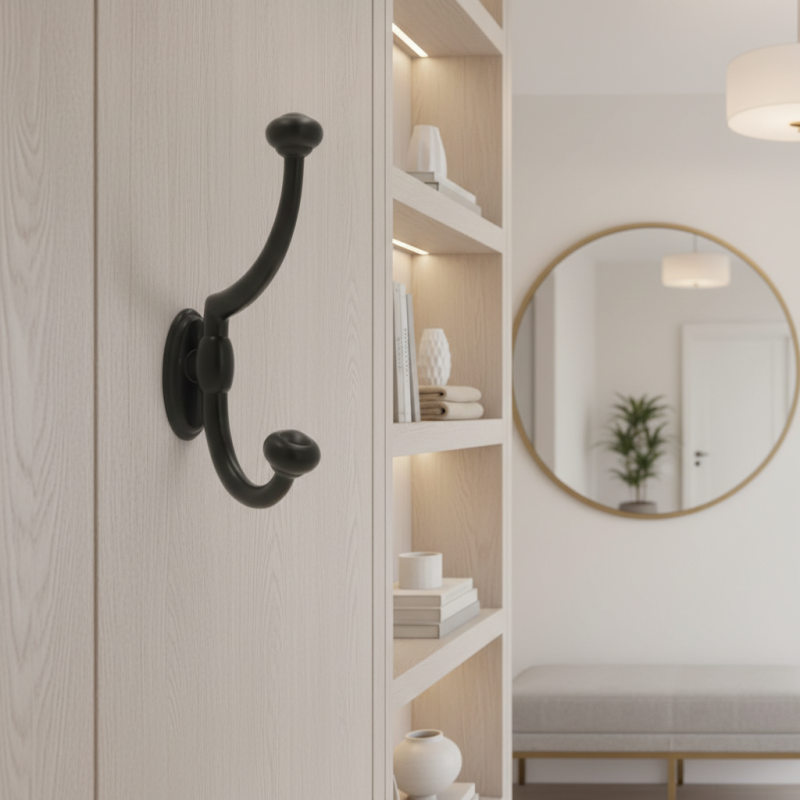 Rustikálny vešiak PLUTO v modernom prevedení čierna matná spája klasický tvar s nadčasovým minimalistickým vzhľadom. Dvojitý háčik poskytuje praktický priestor na zavesenie oblečenia, kabeliek, batohov či doplnkov, pričom matná povrchová úprava pôsobí elegantne a nenápadne.