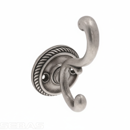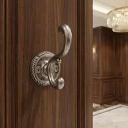 Rustikálny vešiak GALILEO v elegantnom prevedení starostrieborná je štýlovým a funkčným doplnkom do klasických aj rustikálne ladených interiérov. Bohato tvarovaný dvojitý háčik v kombinácii s dekoratívnou kruhovou rozetou dodáva vešiaku tradičný charakter a výrazný vizuálny efekt.